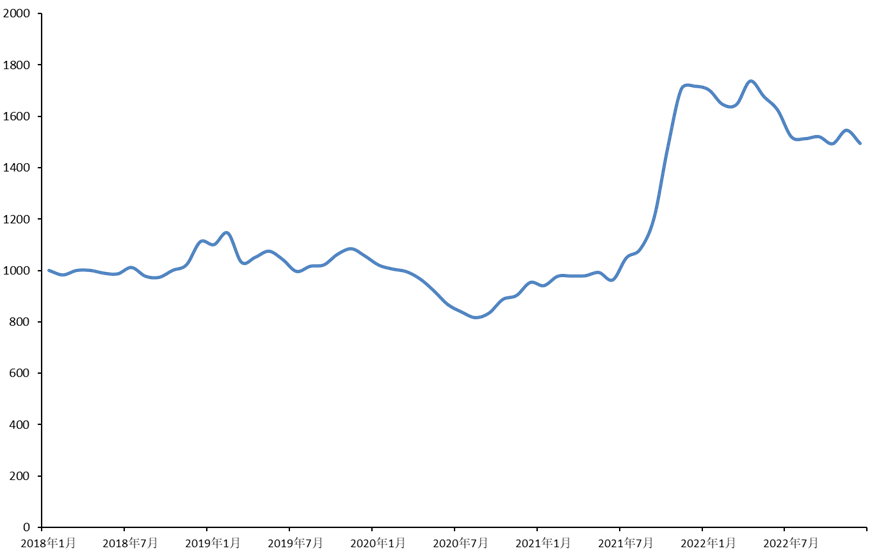 2022年12月,新华·中盐两碱工业盐价格指数报1494.04点,较上期(2022年11月)下跌51.38点,跌幅3.32%;较基期(2018年1月)上涨494.04点,涨幅49.40%;较周期内最高点1736.66点(2022年4月)下跌242.62点,跌幅13.97%;较周期内最低点816.2点(2020年8月)上涨677.84点,涨幅83.05%。