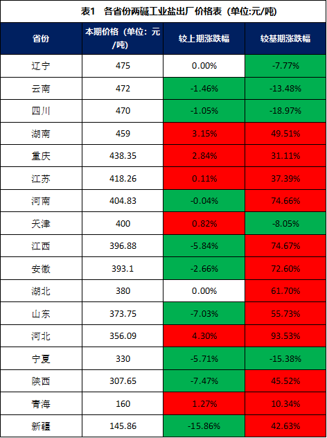 分价格区间来看,本期两碱工业盐单价在400-500元/吨之间的地区有8个,分别是辽宁、云南、四川、湖南、重庆、江苏、河南、天津;两碱工业盐单价在400元/吨以下的地区有9个,分别是江西、安徽、湖北、山东、河北、宁夏、陕西、青海、新疆。