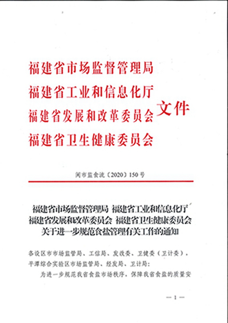 福建省市场监督管理局 福建省工业和信息化厅 福建省发展和改革委员会 福建省卫生健康委员会关于进一步规范食盐管理有关工作的通知