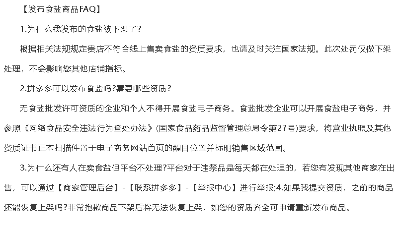 问:拼多多平台多家店铺销售食盐,未在其首页显著位置公示营业执照、食盐定点批发企业证书等信息,拼多多平台的行为违反了《上海市盐业管理规定》第十条、《关于进一步加强食盐专营管理有关工作的通知》第六条之规定,请相关主管部门依法处置。