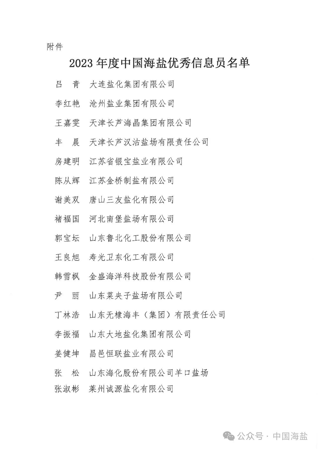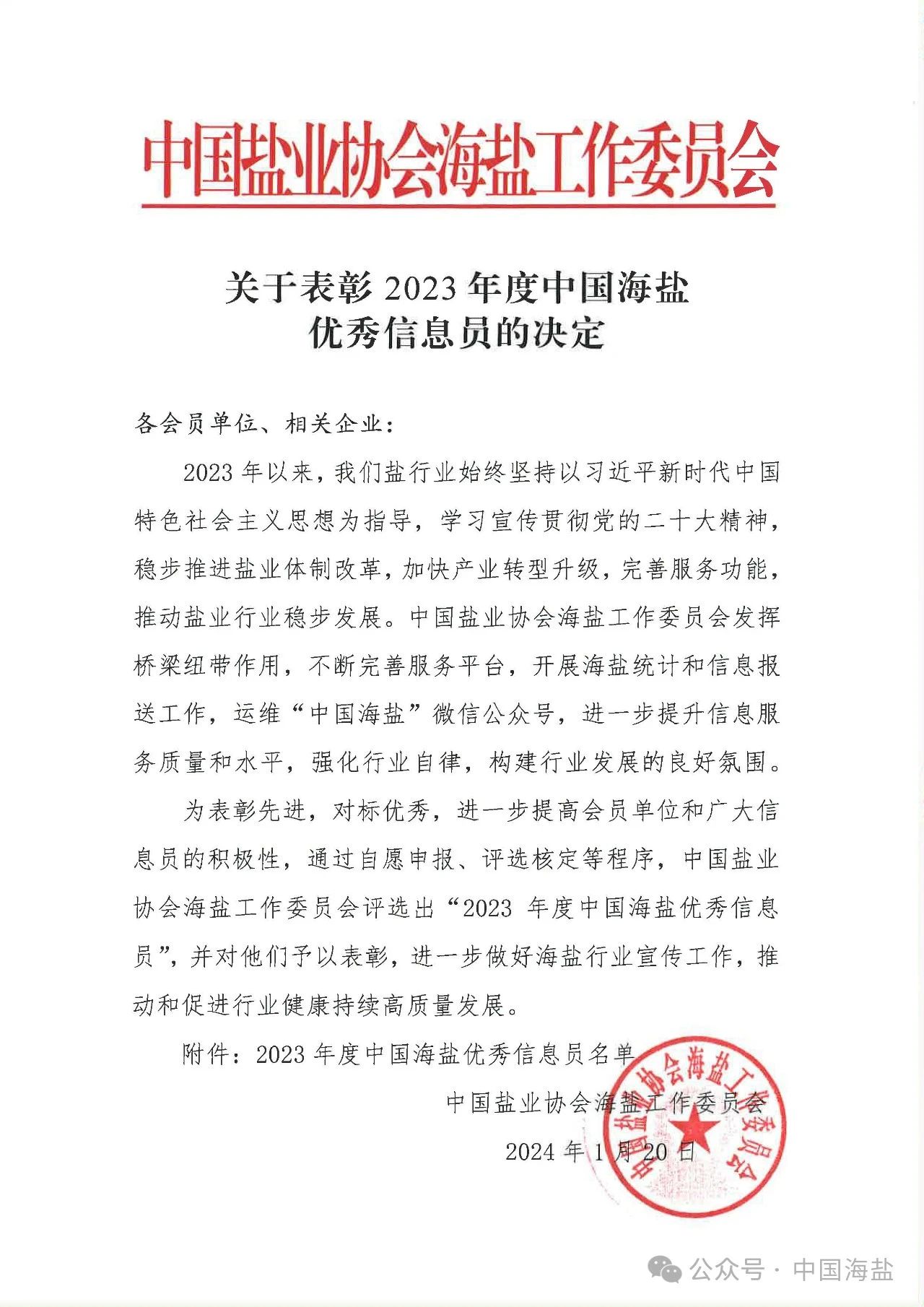 2023年以来,我们盐行业始终坚持以习近平新时代中国特色社会主义思想为指导,学习宣传贯彻党的二十大精神,稳步推进盐业体制改革,加快产业转型升级,完善服务功能,推动盐业行业稳步发展。华体会在线客服海盐工作委员会发挥桥梁纽带作用,不断完善服务平台,开展海盐统计和信息报送工作,运维“中国海盐”微信公众号,进一步提升信息服务质量和水平,强化行业自律,构建行业发展的良好氛围。 为表彰先进,对标优秀,进一步提高会员单位和广大信息员的积极性,通过自愿申报、评选核定等程序,华体会在线客服海盐工作委员会评选出“2023年度中国海盐优秀信息员”,并对他们予以表彰,进一步做好海盐行业宣传工作,推动和促进行业健康持续高质量发展。