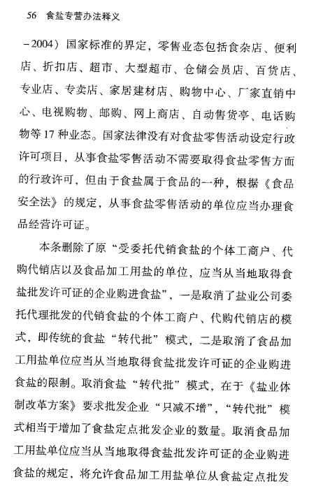 总之,盐改后食品加工用盐进货退出专营监管后,食盐批零进货总体上执行《食品安全法》第五十三条的基础上,由盐业主管部门实施该法没有规定的食盐零售单位从非食盐定点批发企业购进食盐行为的“食盐营销最后一公里”食盐供应安全执法,应当接地气地认真开展执法。