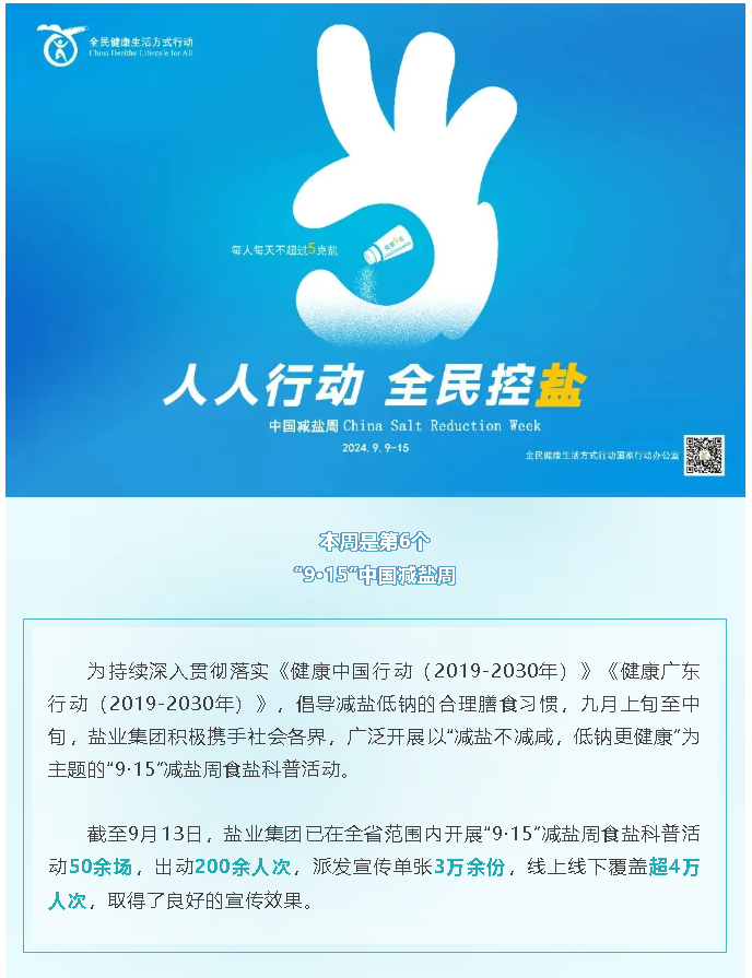 “9·15”中国减盐周|减盐不减咸,低钠更健康——盐业集团开展减盐周食盐科普活动——广东国资 2024年09月14日 20:47 广东