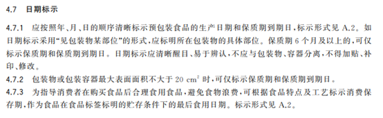 二是解决食品日期“看不清”问题。《标识办法》规定应当在预包装食品标签上使用白底黑字等颜色对比明显的形式标注生产日期、保质期到期日。生产日期、保质期到期日标注的字体最小高度从现行的1.8毫米,按照包装最大表面面积不同分层次提升,其中,最大表面面积大于35平方厘米(含)的包装标注的字体最小高度提升至3.0毫米,其他小包装标注的字体最小高度提升至2.0毫米。