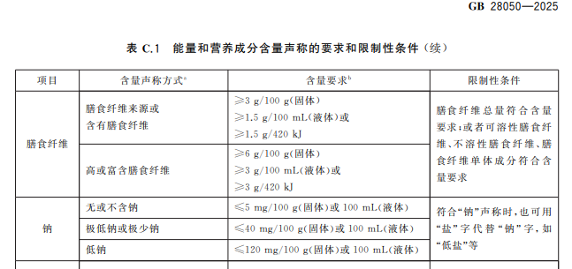 表C.1 能量和营养成分含量声称的要求和限制条件