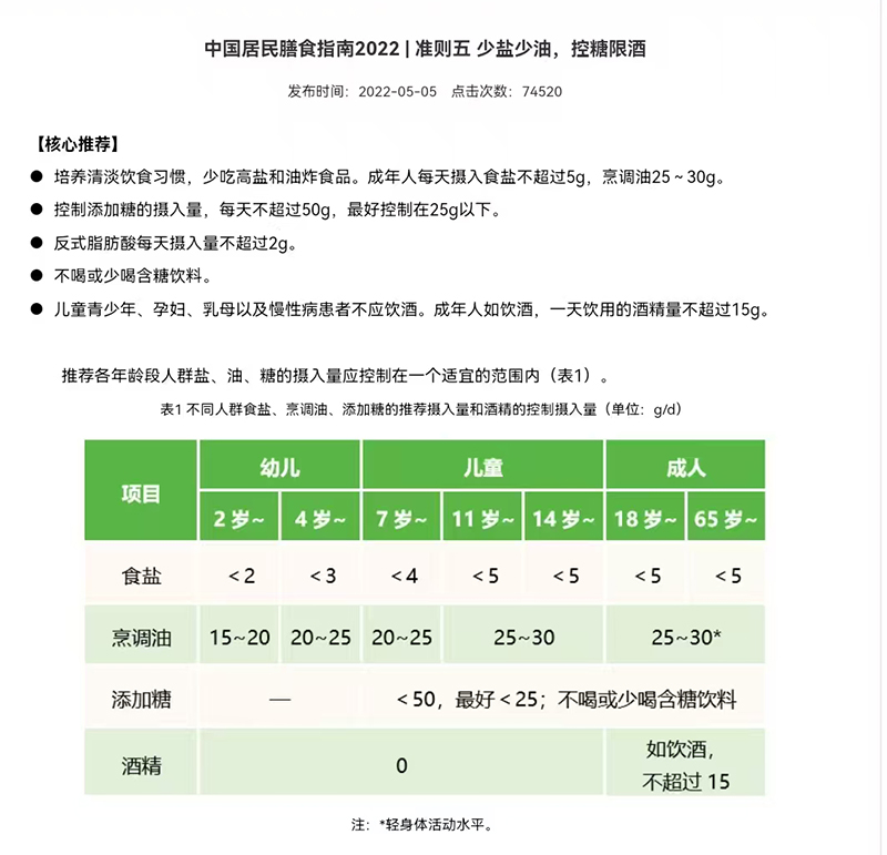 6、《中国居民膳食指南》(2022)【核心推荐】培养清淡饮食习惯,少吃高盐和油炸食品。成年人每天摄入食盐不超过5g,烹调油25~30g。
