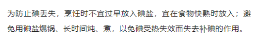 食用方法:烹饪时宜在食物快熟时放入碘盐,避免用碘盐爆锅、长时间炖、煮。