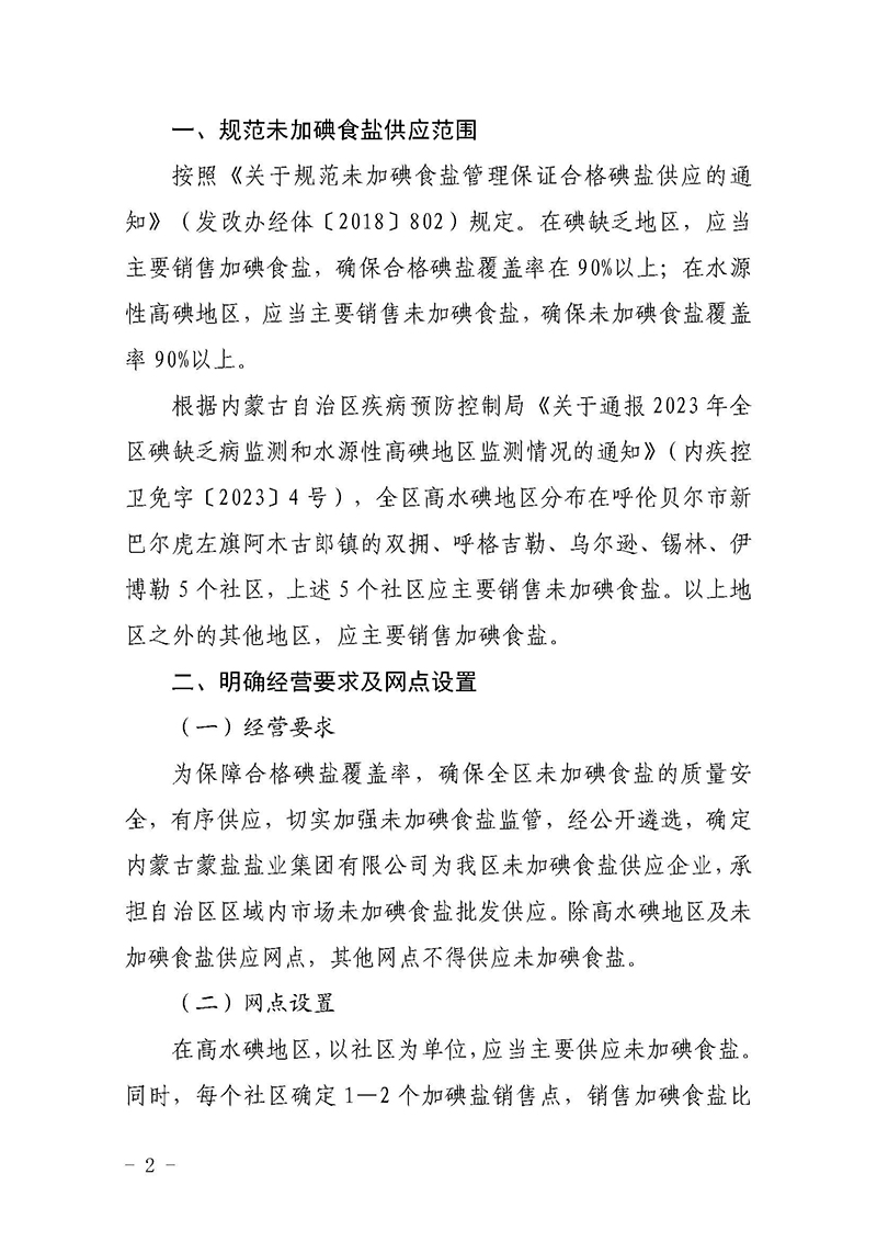 经营主体方面:依照国家相关文件要求,自治区工信厅通过公开遴选的方式,确定内蒙古蒙盐盐业集团有限公司为内蒙古自治区未加碘食盐供应企业。保障自治区范围内未加碘食盐充足有序供应,合格食盐全面稳定覆盖。同时,不限制其他符合要求的销售主体进入内蒙古自治区市场。