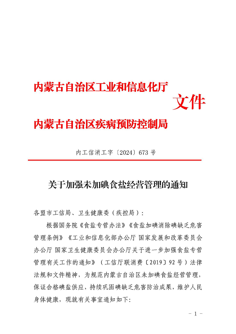 为规范内蒙古自治区未加碘食盐经营管理,保证合格碘盐供应,持续巩固碘缺乏危害管理成果,维护人民身体健康,内蒙古自治区工业和信息化厅联合疾病预防控制局制定印发《关于加强未加碘食盐经营管理的通知》(内工信消工字〔2024〕673号,以下简称《通知》),为推动各盟市盐业主管部门及市场经营主体科学精准的执行文件精神及要求,营造更为公平有序的市场环境,我们对文件中的重点内容作如下解读。