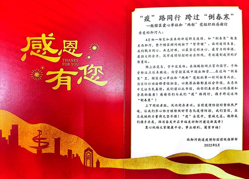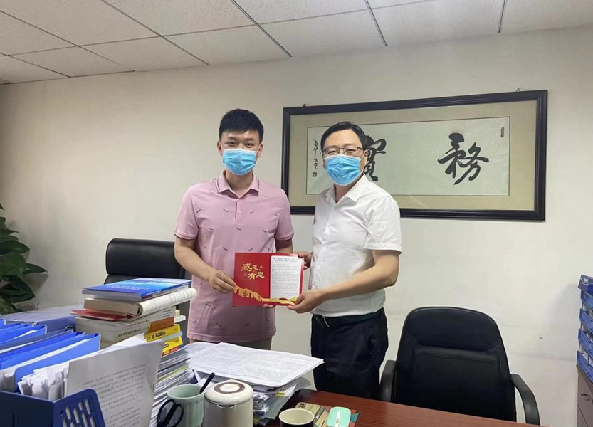 5月12日,受西御河街道办事处、西御河街道疫情防控前线指挥部委托,西御河街道鼓楼社区党委书记、居委会主任宋德斌前往总公司拜访并送交感谢信,诚挚感谢省盐业总公司在今年4月初突如其来的新冠疫情中,主动落实防控工作措施,积极捐赠防控物资,与西御河街道办及街道疫情指挥部“疫”路同行,携手跨过了这场“倒春寒”。