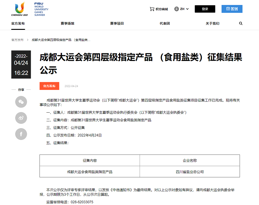五一劳动节前夕,从成都第31届世界大学生夏季运动会官网获悉,成都第31届世界大学生夏季运动会第四层级指定产品(食用盐类)征集结果公示结束。经过严格筛选,四川省盐业总公司成为成都大运会第四层级(食用盐类)赞助商,川晶牌食用盐正式成为成都第31届世界大学生夏季运动会指定食用盐。