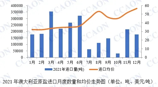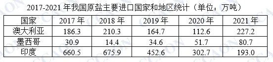 澳大利亚西海岸北部有得天独厚的晒盐条件,是世界少有的天然盐场。生产的全过程机械化和自动化程度较高。大多澳洲各盐厂有自己专用码头,运往世界各地。我国进口澳大利亚原盐的时间较久,进口量占总量的比例也一直较高。印度受疫情及自然灾害影响,出口工业盐一直处于不稳定状态,澳盐在我国市场需求空间提升,2021年我国澳盐进口量位于进口盐首位。