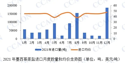 南美洲主要产盐时间为每年的一、四季度,自用量较少。墨西哥盐主要出口到日本、美国等地。近年来,在印度盐影响下,我国进口墨西哥盐的数量整体处于较低水平。2021年,尽管进口市场上涨,但由于部分墨西哥盐合同为两年制长单,进口原盐成交均价处于相对平稳水平。由于印度进口盐总量大幅下调,墨西哥盐市场关注度有一定增加,推动墨盐进口需求上升,进口总量达到近几年高位。
