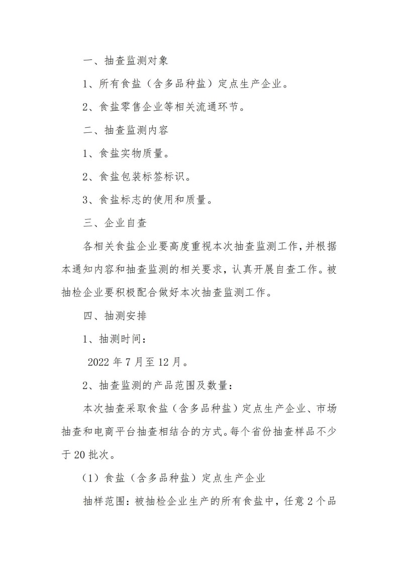 请各相关食盐企业高度重视本次抽查监测工作,并根据本通知内容和抽查监测的相关要求,认真开展自查工作。被抽检企业要积极配合做好本次抽查监测工作。
