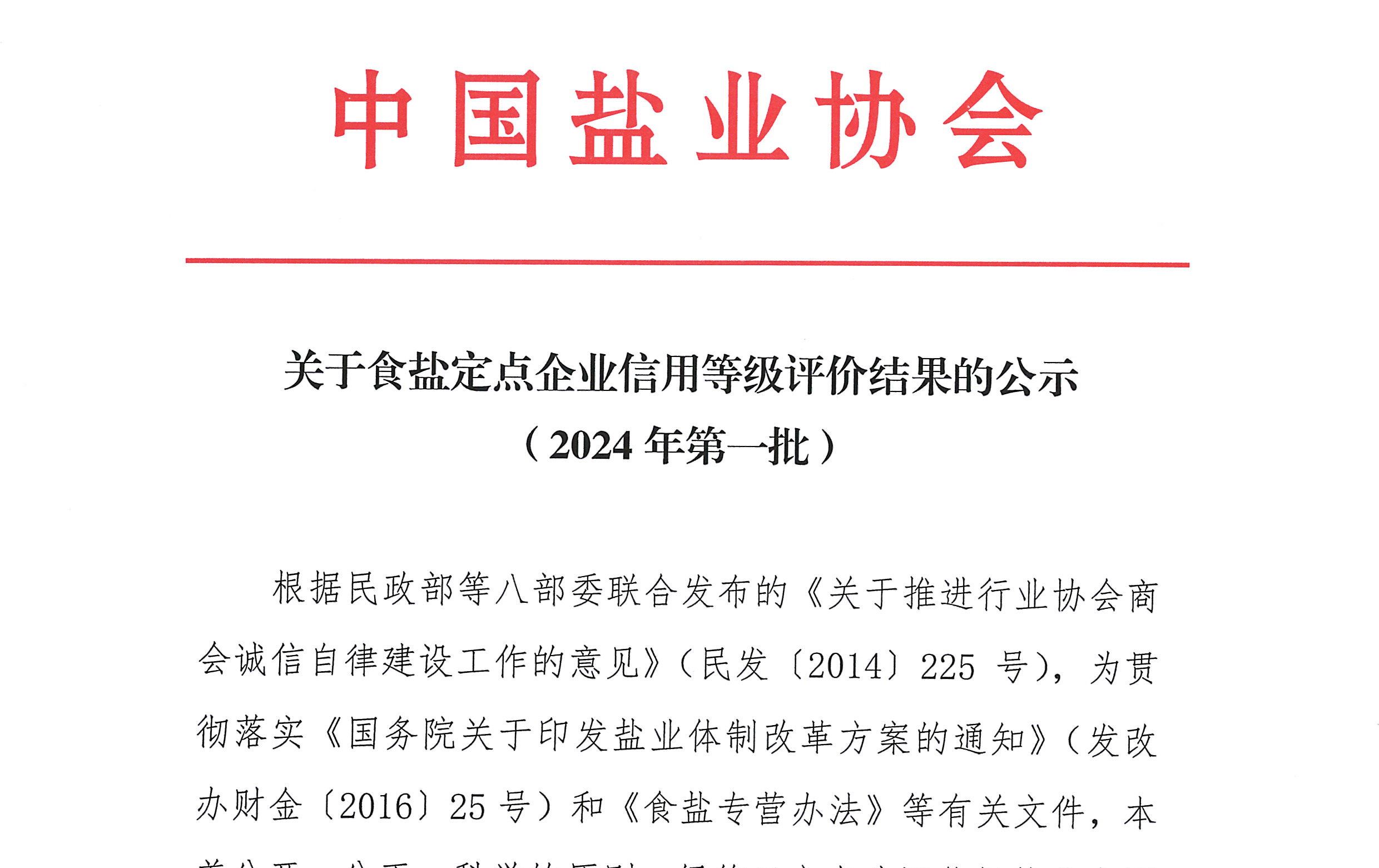 根据民政部等八部委联合发布的《关于推进行业协会商会诚信自律建设工作的意见》(民发〔2014〕225号),为贯彻落实《国务院关于印发盐业体制改革方案的通知》(发改办财金〔2016〕25号)和《食盐专营办法》等有关文件,本着公开、公正、科学的原则,经第三方专业评价机构北京国富泰信用管理有限公司严格评价,并通过中国盐业企业信用等级评价委员会审核,现将华体会在线客服食盐定点企业信用等级评价结果向社会进行公示。公示期为10天(2023年10月12日-2023年10月21日)。
